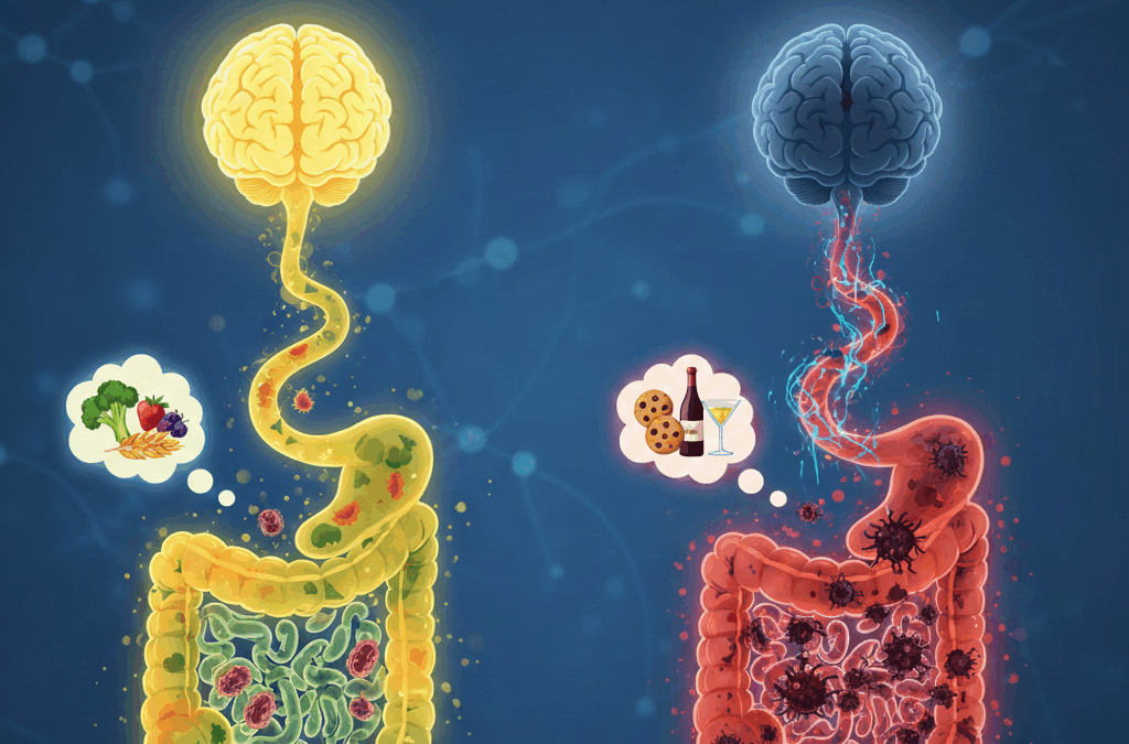 Chronic stress raises cortisol, lowers helpful bacteria, and increases emotional cravings—especially for sweets and alcohol (Farzi, Fröhlich, & Holzer, 2018).