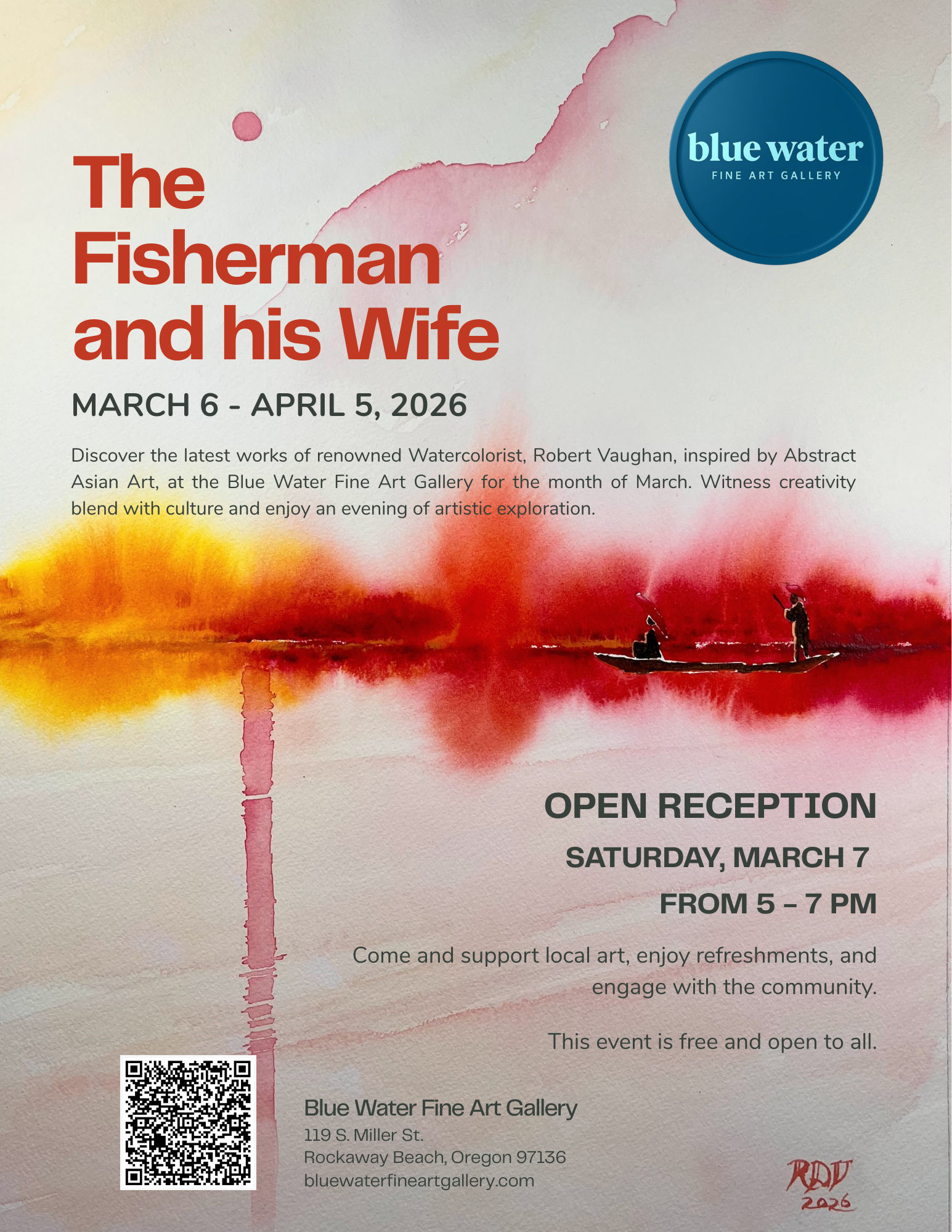 Immerse yourself in an evening of creativity at Blue Water Fine Art Gallery as we highlight our March Featured Artist, acclaimed watercolorist and local resident Robert Vaughan. His exhibition, “The Fisherman and his Wife“, is open from March 6 to April 5, presenting a luminous series of watercolor pieces influenced by the refined simplicity of Abstract Asian Art. Vaughan’s work, characterized by stylized figures, gentle horizons, and understated narrative moments, offers each painting as an individual visual story.