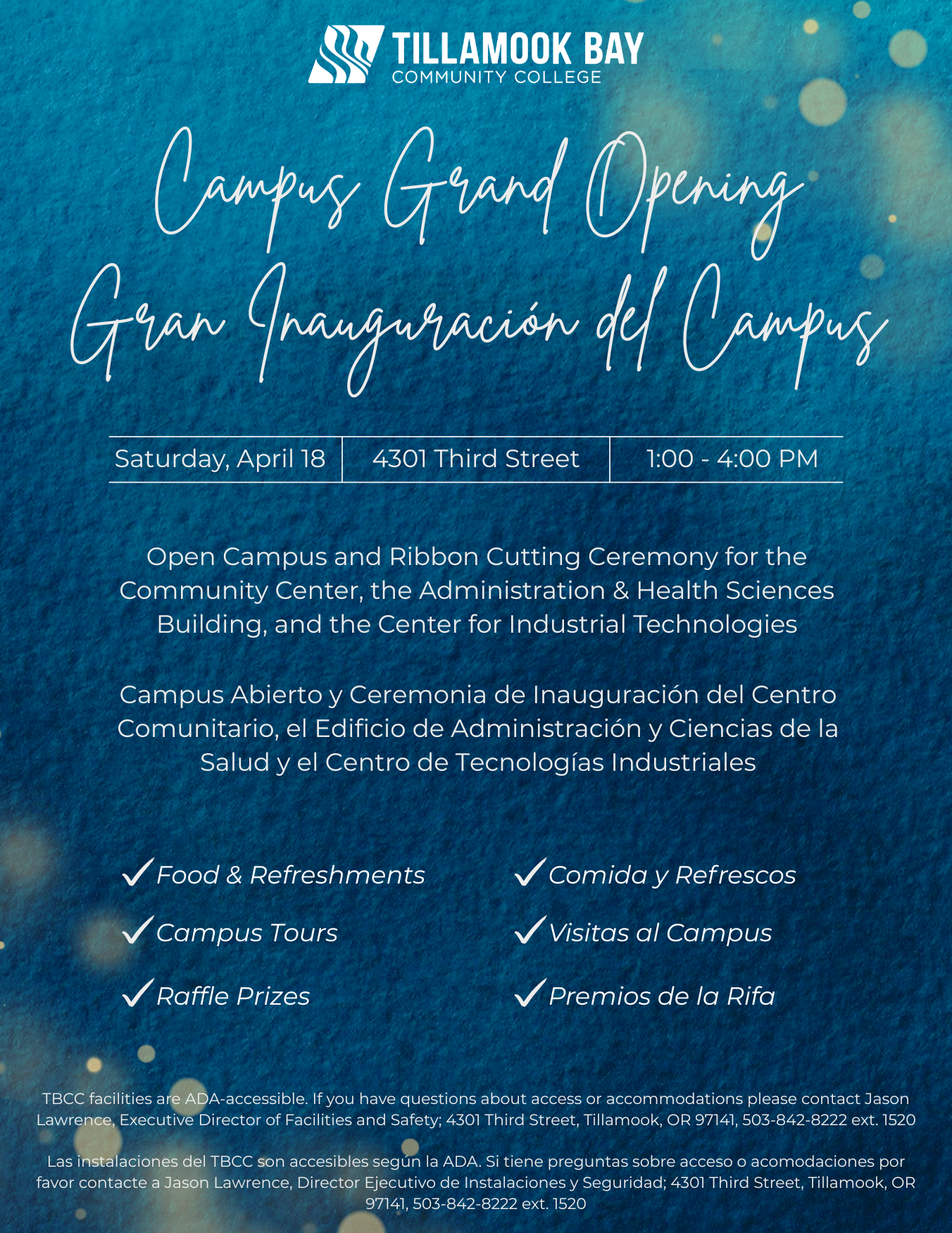 On Saturday, April 18, Tillamook Bay Community College will be hosting its Grand Campus Opening! This event celebrates the official opening of the Administration & Health Sciences Building, the Center for Industrial Technologies, and the Community Center (located in AHS). There will be food, tours, special guests, a ribbon-cutting, and so much more. Please join us and celebrate TBCC’s innovation and growth. This event is for the entire community; this campus is yours and was made possible by Tillamook County Voters.