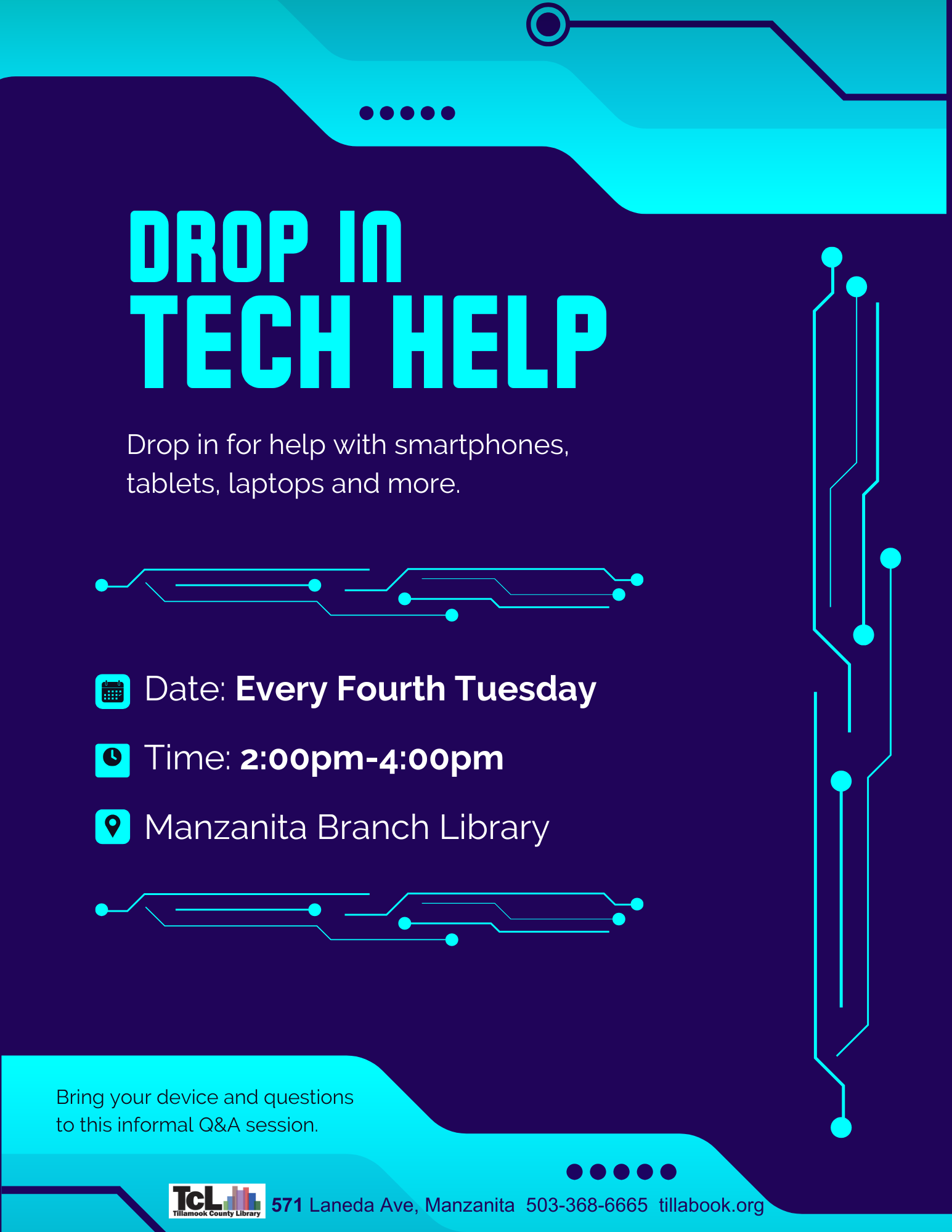 Get help with smartphones, tablets, laptops, and more in an informal Q&A setting at the Manzanita library every 4th Tuesday 2-4 pm!