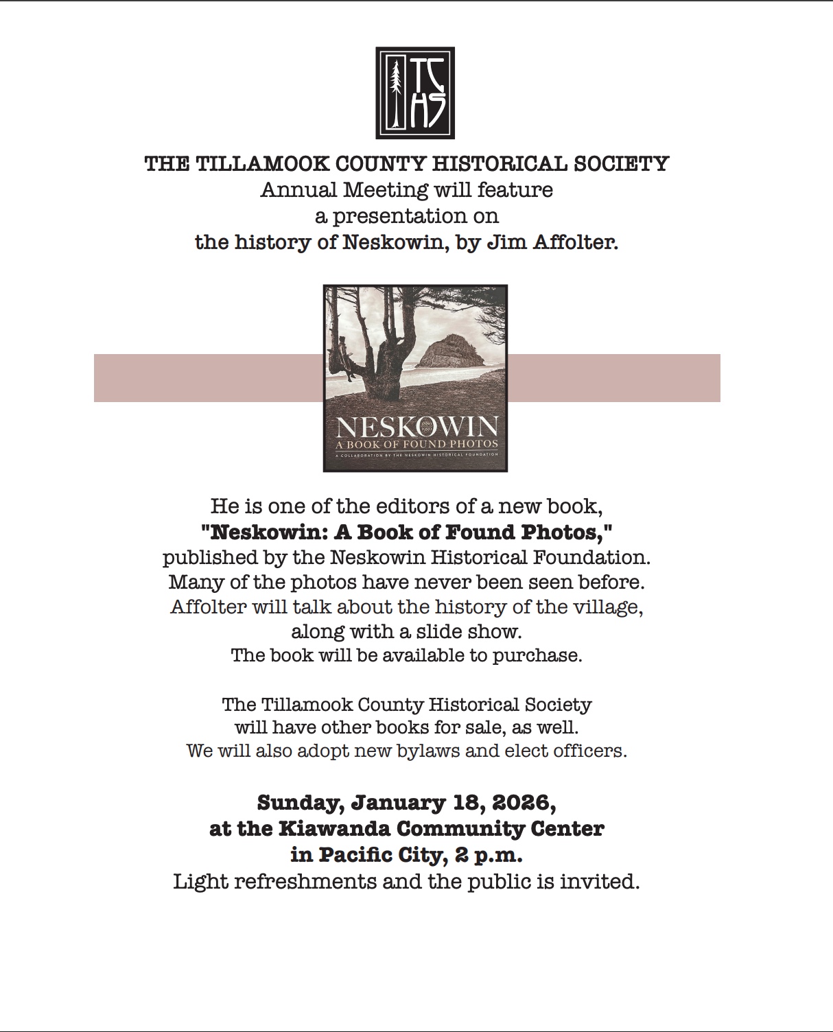Step back in time and discover the rich story of our coast at a special presentation on the History of Neskowin, presented by local historian Jim Affolter at the Kiawanda Community Center. From early settlement and community roots to the events that shaped this unique seaside town, Jim brings Neskowin’s past to life with insight and engaging storytelling. Whether you’re a longtime local or new to the area, this is a wonderful opportunity to connect with the history that makes our community so special. Join us for an informative and fascinating evening you won’t want to miss!