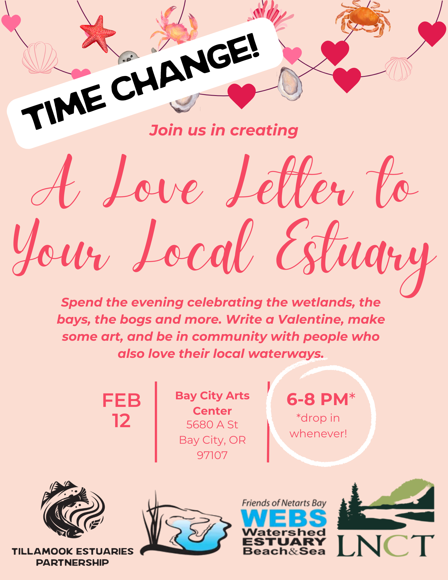 What’s love got to do with… wetlands!? Drop into Bay City Arts Center from 6 – 8PM on Thursday night, February 12th to hang out and craft valentines for your loved ones AND for your local estuary! Friends of Netarts Bay Watershed, Estuary, Beach, and Sea – WEBS, Tillamook Estuaries Partnership (TEP) and Lower Nehalem […]